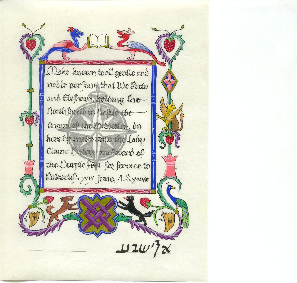The verdict on the Pie Snit: cute idea for an event, great idea for a feast, not the best site. (Photos up at: http://photos.yahoo.com/taylorlibrary/) The site was a community building in a small town not far from Black River Falls, WI (which is itself none too large). The site itself was actually rather nice (adequate space, clean, lovely kitchen with all the amenities, etc.) but it wasn't air-conditioned, meaning that we had to leave all the doors open all day to get any air (it was at least 90 degrees out all day). This meant: 1. It was hot (obviously), 2. it got very buggy at night without getting any cooler, and 3. my allergies were pretty bad because I was essentially outdoors all day. No one stayed overnight; when the bardic circle started shedding bards at about 10:30, several Shire members at once had the idea that maybe no one should stay, in this heat with all these bugs. In the end there were only three or four people who had planned to stay over who did not have an easy way to get home, and Shire members made sure they were going to be able to find someone to stay with, and then we went home too. Looks like I started with the end, though. Okay, back to the beginning. The day itself was very nice. There were 47 people on site and it was about a quarter Rokeclif, a quarter Shattered Oak, maybe 1/8 Coille Stoirmeil, and the rest from all over. A carload came down from Mistig Waetru (including Cyveilog, one of Princess Elashava's rapier guard, who it turns out plays a mean tuba and sings in a lovely rich enthusiastic bass...yes, I recruited him for the Northshield Choir) and Dahrien and Mysie came from Caer Anterth. It was wonderful to have some time to hang out with them--they are definitely two of the most fun, most generous people I have ever met in the SCA. After some hanging-out time, I went to Wyndreth's bardic discussion, which was similar to the last of her discussions I went to, except that no one person monopolized the discussion, so we all got some good talking in. I then hung out until the trivia contest, which turned out to be another of Kudrun's blockbuster projects: perfectly organized, extremely creative, and crammed with opportunities for humorous moments. Shattered Oak won, which was okay with us; somehow they managed to field an entire team, while we convinced Christian, Dahrien, and a friendly newbie from Falcon's Keep to play for Rokeclif. So I guess they deserved to win on their own merit. Didn't get to see the pie-ing of Her Stellar Highness, though I did get to see Her and Her champions getting hosed down afterwards (sample dialogue: "Have you seen the Princess?" "Yes, she's over there getting hosed down."). I am liking Elashava more and more every event. Not that I didn't like her before. Occasionally someone asks me whether I had thought of using my Hebrew name as my SCA name, and I reply that I had, but then I went to an event in Madison (my second SCA event, I believe) and I saw this friendly woman with an alert gaze and a baronial coronet sitting up front. I liked her immediately, and when I found out her name was Elashava, that put an end to the idea of my taking on my Hebrew name in the SCA. Why? My Hebrew name is Elisheva. I didn't want anyone thinking I would usurp that gracious Lady's name. I emcee'd Her Stellar Highness' concert, during which (among many other performers) I read "Music Like Silk" because I thought Elashava would like to hear a story about a Jewish persona, and I sang a filk of "Twa Corbies" with Kudrun, and (because I was sorta sad he was missing all this, even though I knew he was probably having a blast in Ealdormere) I sang Owen's "Song for Northshield" because that's one of my favorites of his. Wary of grandstanding, that was all I was going to do, but Her Highness requested "Three Words" (which I wrote for her, after all), and how could I refuse? So, with Finn MacArt playing the drum, I sang the piece (not my best performance, but okay). As I was curtsying during the applause, out of the corner of my eye I noticed Dahrien popping up from his chair, running around the audience, past Elashava, and whoah, running right up to me, where he threw his arms around me, picked me up, and whirled me around in the air for about twelve seconds straight while I shrieked with laughter. Damn, what IS it about this song that makes people react so strongly? I think if I knew that, I'd be in a better position to go on and write other things that people like. But I'm in the dark. We had pie for feast, which is the biggest understatement of the century. We had about 45 pies for feast, perhaps 40/60% savory/sweet. It was the ultimate potluck feast, except with a theme and an easily portable, endlessly varied format. Sarra complained that too many people brought dessert pies, so that we had a lot left over; I told her it was still the most delicious, most varied feast I had ever been to, and she ought to write it up for Tournaments Illuminated. (If she doesn't, I will.) No one went hungry. I took one plate of food and nursed it all the way through feast, never going back once, and was stuffed to the gills when I was done. My pies turned out very respectably: you couldn't taste the wine or the ginger (or the waxed paper) in the Pye de Paris, which was my worry, and the Tarte d'Alsace had a very yummy mellow custard base and flavorful apples. I'm saving those recipes--in the end, they really weren't very hard to make. Quite a fruitful Court for those in attendance: Sarra, Kudrun, Cybele, and I got Purple Frets. Go see my gorgeous scroll! Mysie did it especially for me, designed after a piece from the Barcelona Haggada! It's even on real vellum! It doesn't say much, but as Elashava handed it to me, she said "There wasn't room for all the things I wanted to put on this." It was a big surprise, and a very pleasant one. What made it really unique for me is that this is the first time I have gotten a scroll that was made by someone who knew me and was 