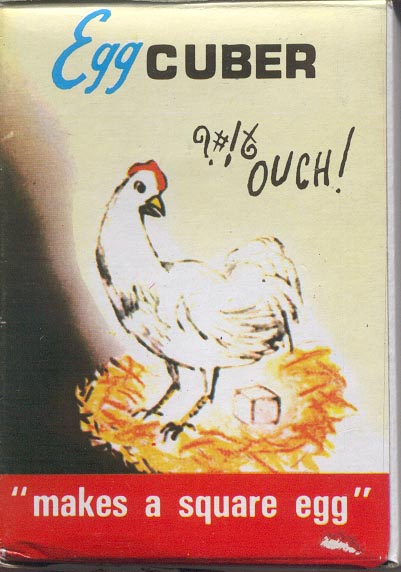 Guest contributor: Colin (quoted from his e-mail with his permission) What to do with cubical eggs? The mind boggles at the possibilities. Well, first and foremost, they won't roll off the cutting board while you're slicing them. You could use them to make a Deviled Castle for a protein-rich subtlety. Ovo-lacto vegetarians could paint spots on them and use them as dice just to piss off all their vegan friends. It's obviously the predecessor to the cubical watermelon, although those spherical carrots are just as obviously a step in the wrong direction... For the obsessive-compulsive person in your life, you can slice them and put them on saltines and there aren't any little cracker corners extending out past the edges of the (normally round) egg slices... And, most importantly, if you swallow them whole, you're less likely to choke on them as they don't block the airway as effectively. More later, I'm sure. Ohh, yes... ===== ------------------- Colin Blackthorn